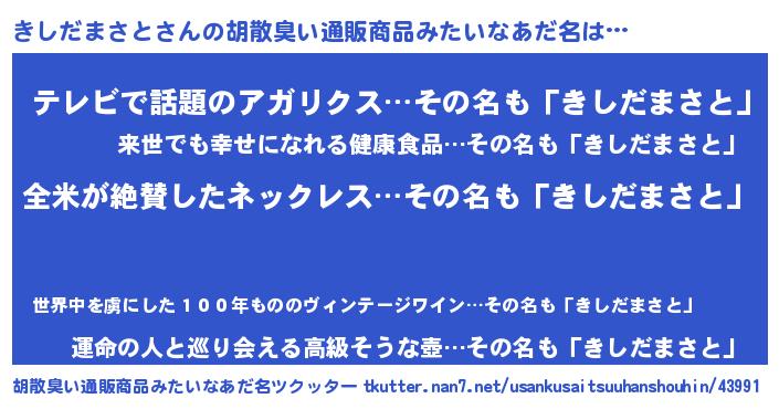 | 男性向けラノベタイトル風あだ名 | 『きしだまさと~年齢イコール彼女いない歴の魔法使い~』 |