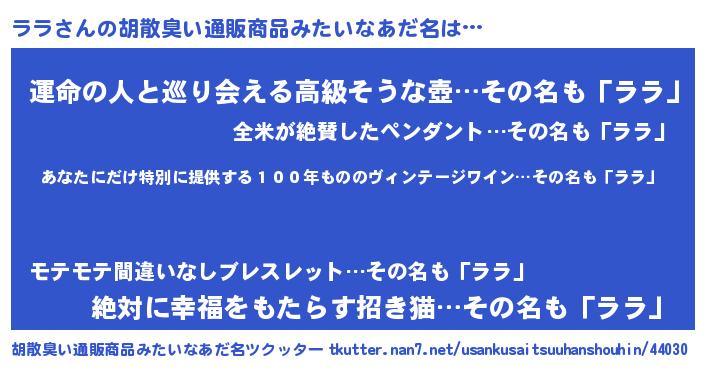 | 意味不明あだ名 | 『住所不定無職ララ(8歳)』『永久保存ララ』 |