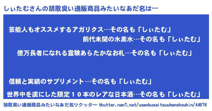 | 意味不明あだ名 | 『ペロリンしぃたむ』『自称しぃたむ』 |