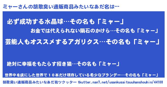 | ヘコむあだ名 | 『ミャにゅー』『ミャー(笑)』『豆乳』 |