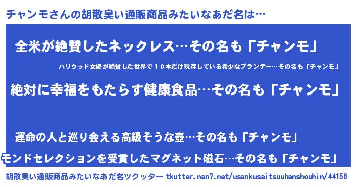 | 男性向けラノベタイトル風あだ名 | 『チャンモという概念が存在しない退屈な世界 』 |