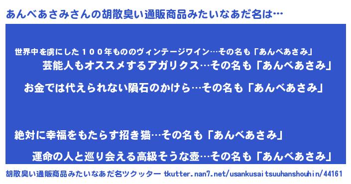 | ヘコむあだ名 | 『豆乳』『あんべあさみ(笑)』 |