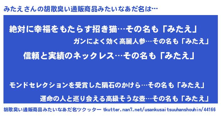 | 欧米人風あだ名 | 『ウサインみたえ』『ダルビッシュみたえ』 |