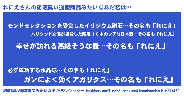 | ヘコむあだ名 | 『つくし』『れににゅー』『れに太郎』 |