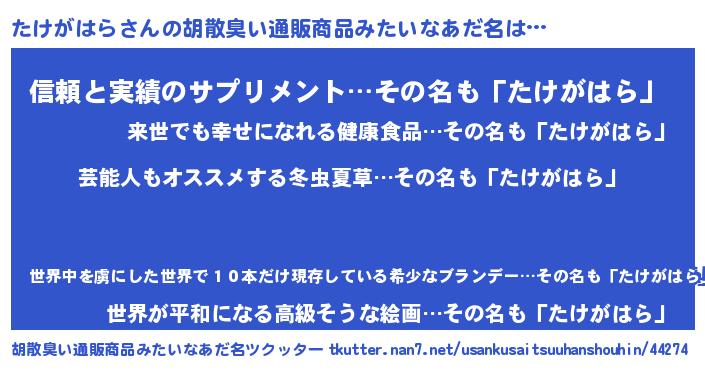 | 男性向けラノベタイトル風あだ名 | 『うちのたけがはらが世界を掌握している!』 |