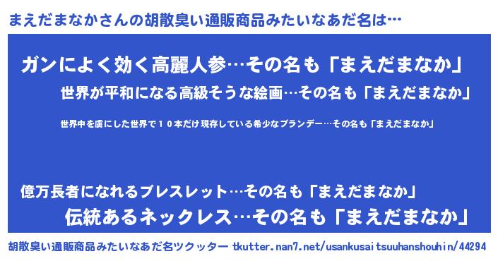 | 意味不明あだ名 | 『住所不定無職まえだまなか(79歳)』 |