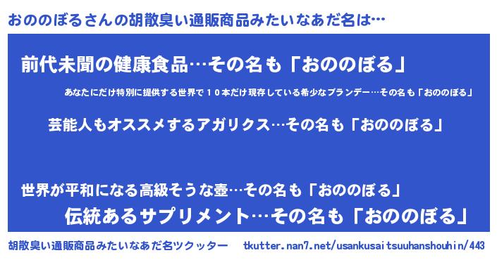 | 男性向けラノベタイトル風あだ名 | 『おののぼるに滅ぼされるだけの簡単なお仕事です』 |