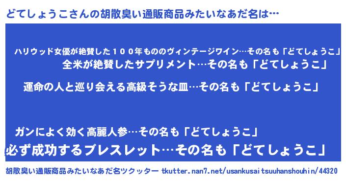 | 男性向けラノベタイトル風あだ名 | 『どてしょうこ~年齢イコール彼女いない歴の魔法使い~』 |
