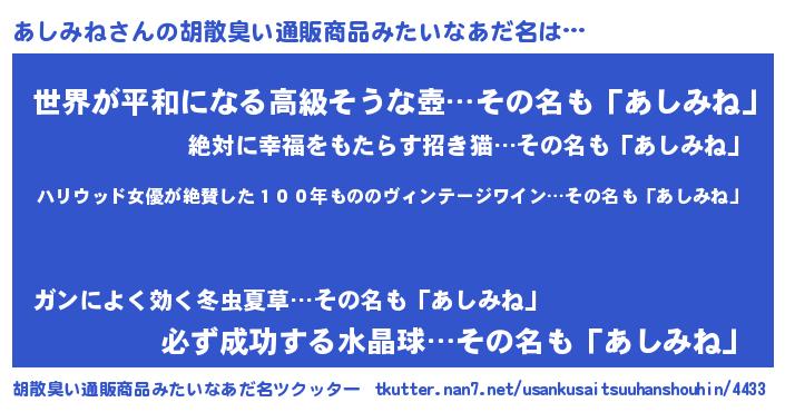 | 意味不明あだ名 | 『住所不定無職あしみね(6歳)』 |