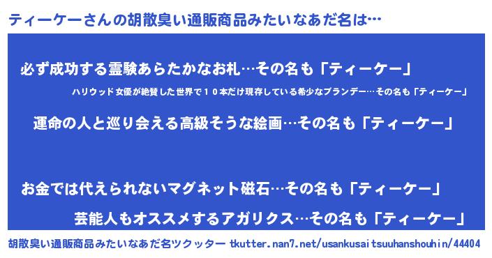 | 男性向けラノベタイトル風あだ名 | 『ティーケーに滅ぼされるだけの簡単なお仕事です』 |