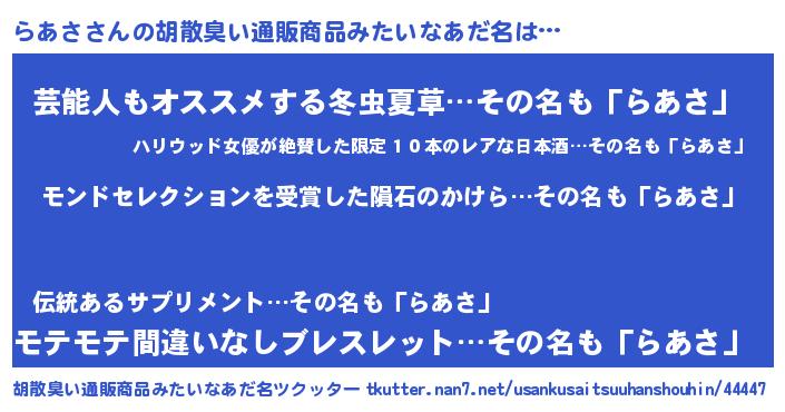 | 欧米人風あだ名 | 『ダニエルらあさ』『ケンブリッジらあさ』 |