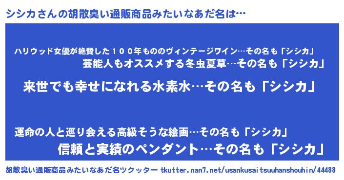 | ヘコむあだ名 | 『シシカ(遠い目)』『シシお』『豆乳』 |