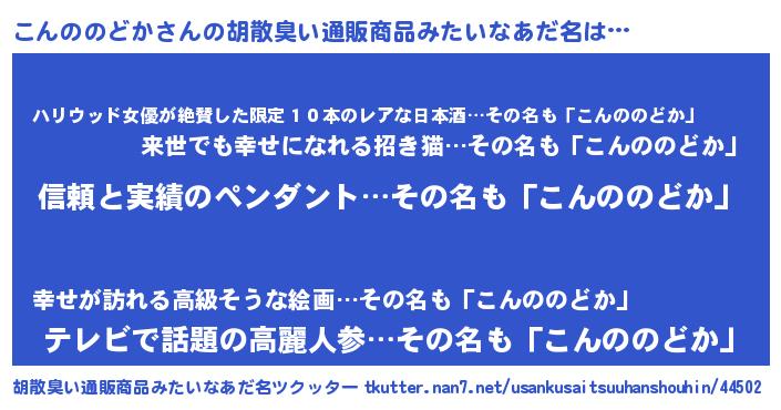 | 男性向けラノベタイトル風あだ名 | 『コンノノドカスレイヤー』 |
