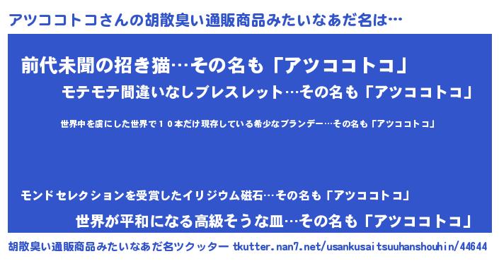| 意味不明あだ名 | 『住所不定無職アツココトコ(85歳)』 |