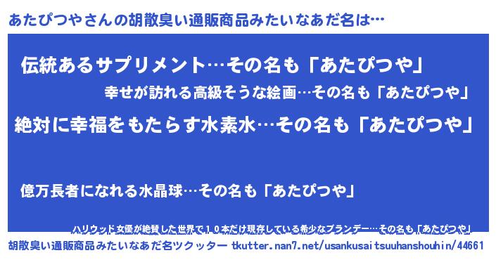 | 女子向けラノベタイトル風あだ名 | 『異世界で失敗しない100のあたぴつや』 |