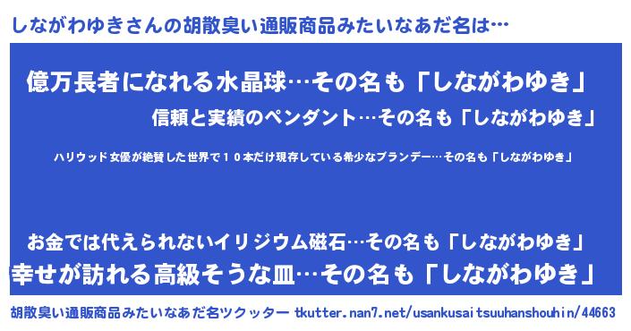| 意味不明あだ名 | 『住所不定無職しながわゆき(71歳)』 |