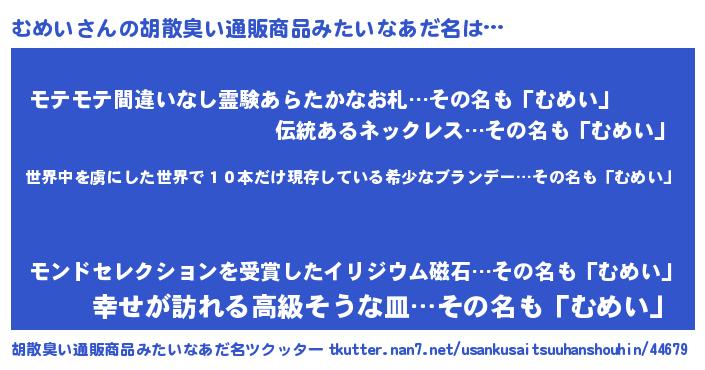 | ヘコむあだ名 | 『むめもー』『なまこ酢』『むめを』 |