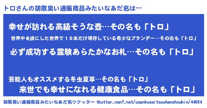 | 男性向けラノベタイトル風あだ名 | 『トロスレイヤー』『魔弾の王とトロ』 |