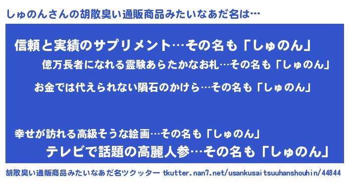 | ヒーロー風カッコイイあだ名 | 『慈愛の使者しゅのん』『黄金騎士シュ』 |
