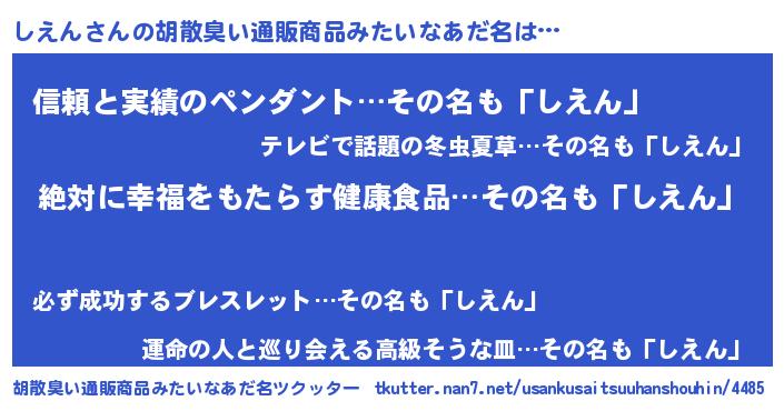 | ヘコむあだ名 | 『しえん(爆)』『しえぷりん』 |