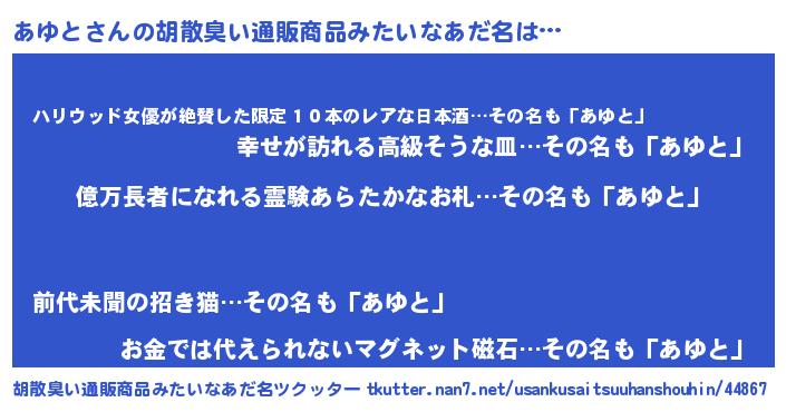 | 欧米人風あだ名 | 『トリンドルあゆと』『マイケルあゆと』 |