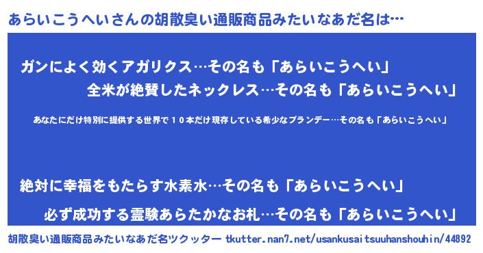 | 意味不明あだ名 | 『住所不定無職あらいこうへい(81歳)』 |