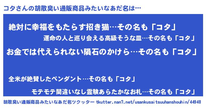 | ヘコむあだ名 | 『コタ(遠い目)』『コタにー』『豆乳』 |