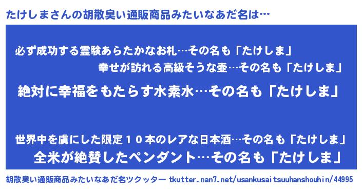 | ヘコむあだ名 | 『たけしま(震え声)』『たけもー』 |