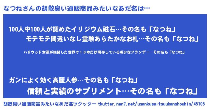 | 欧米人風あだ名 | 『ダレノガレなつね』『ダニエルなつね』 |