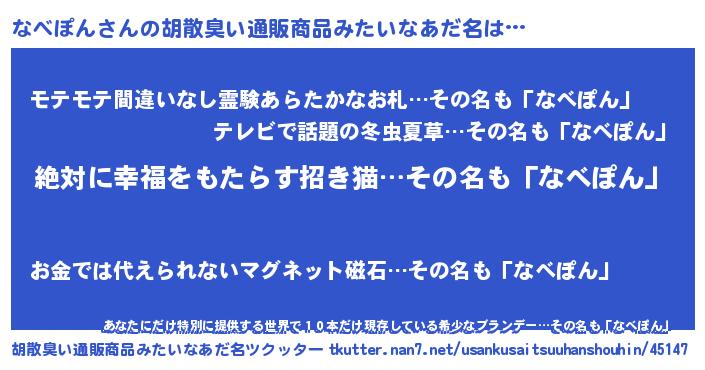 | ヘコむあだ名 | 『なべぽん(小並感)』『なべにゅー』 |