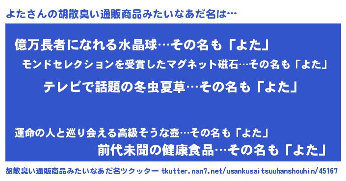 | ヘコむあだ名 | 『よたっふぃ~』『よた(笑)』 |