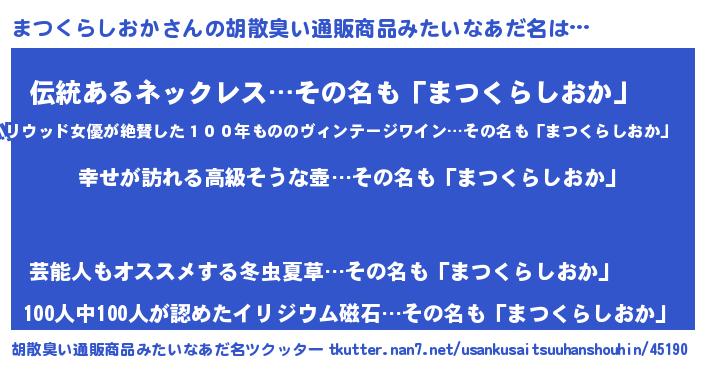 | 男性向けラノベタイトル風あだ名 | 『マツクラシオカスレイヤー』 |