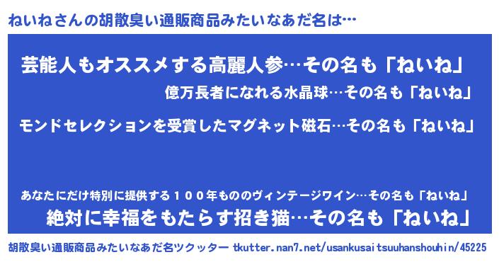 | ヒーロー風カッコイイあだ名 | 『慈愛の使者ねいね』『究極戦士ネイネ』 |