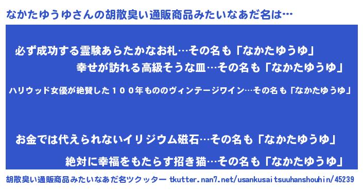 | 意味不明あだ名 | 『住所不定無職なかたゆうゆ(5歳)』 |