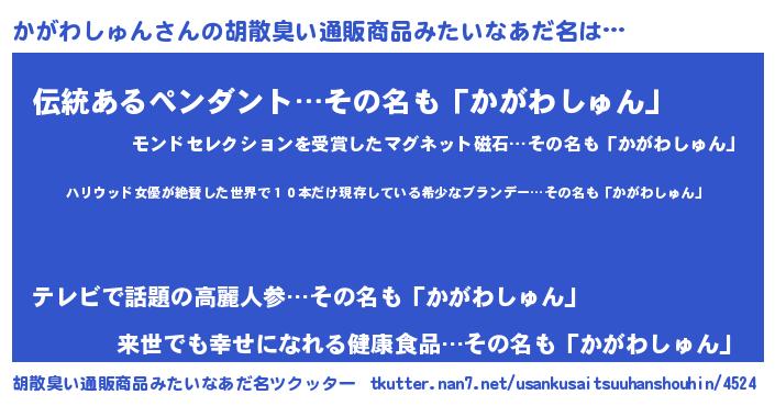 | 意味不明あだ名 | 『住所不定無職かがわしゅん(77歳)』 |