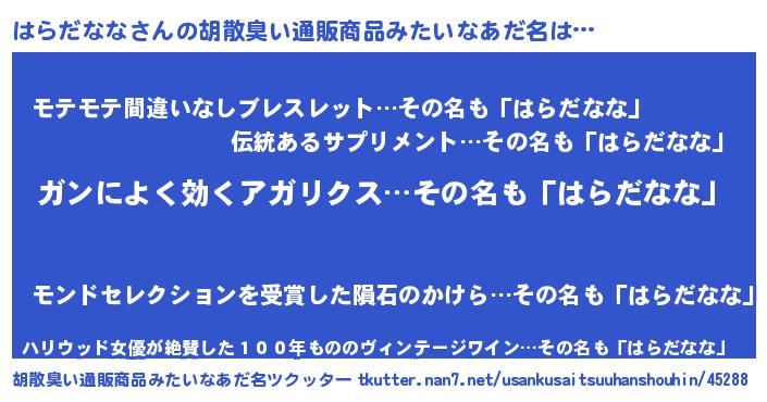 | 意味不明あだ名 | 『自称はらだなな』『ペロリンはらだなな』 |