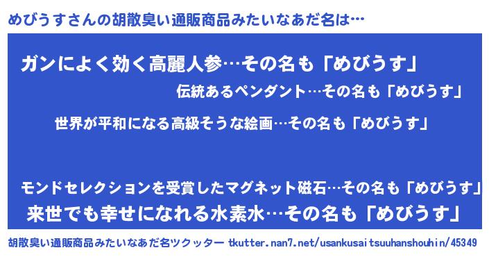 | 意味不明あだ名 | 『もやし科めびうす属』『自称めびうす』 |