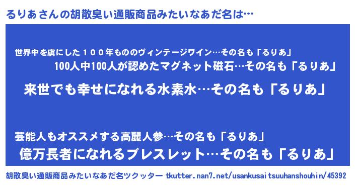 | 意味不明あだ名 | 『永久保存るりあ』『ペロリンるりあ』 |
