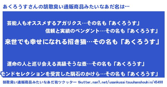 | 意味不明あだ名 | 『永久保存あくろうす』『自称あくろうす』 |