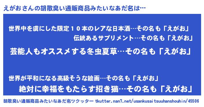 | 意味不明あだ名 | 『自称えがお』『住所不定無職えがお(14歳)』 |