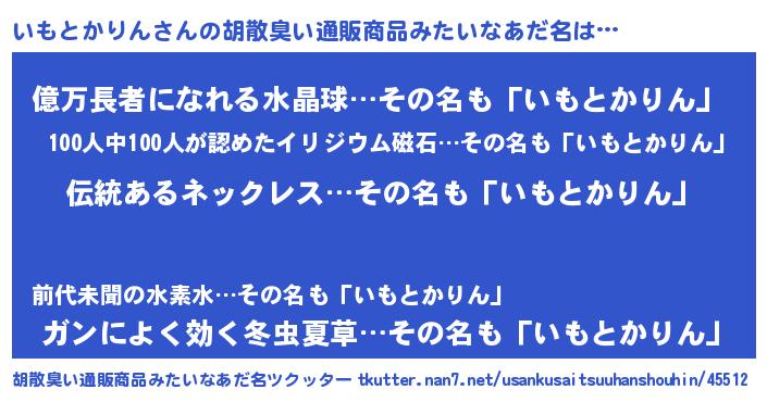 | 男性向けラノベタイトル風あだ名 | 『いもとかりんの嫁は女の子じゃないと思った?』 |