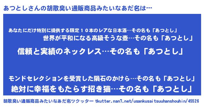 | 意味不明あだ名 | 『とにかく怪しいあつとし』 |