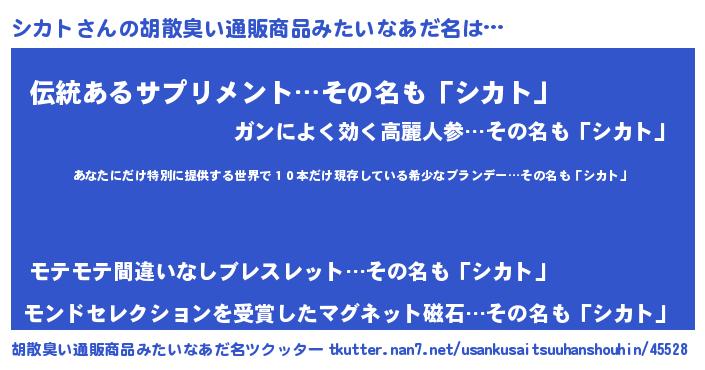 | 意味不明あだ名 | 『住所不定無職シカト(98歳)』『自称シカト』 |