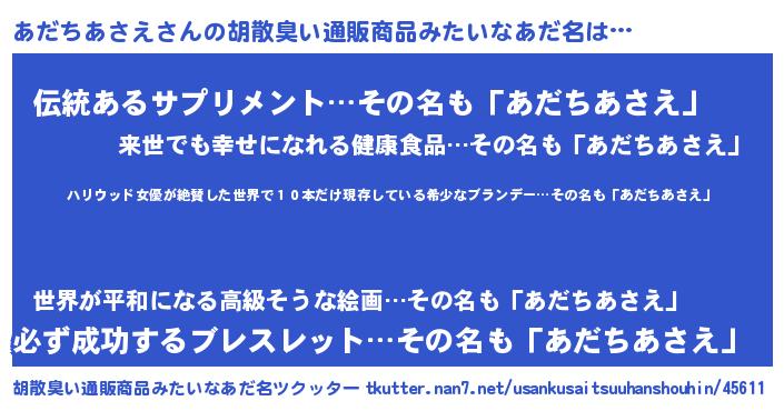 | 意味不明あだ名 | 『住所不定無職あだちあさえ(81歳)』 |