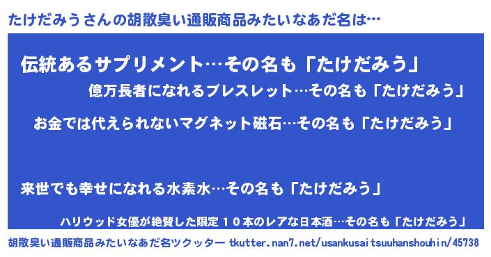 | 男性向けラノベタイトル風あだ名 | 『ノーゲーム・ノータケダミウ』 |
