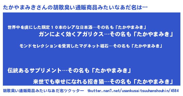 | 男性向けラノベタイトル風あだ名 | 『うちのたかやまみきが世界を掌握している!』 |