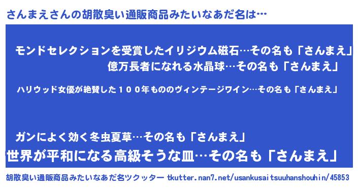 | 男性向けラノベタイトル風あだ名 | 『緋弾のサンマエ』『魔弾の王とさんまえ』 |
