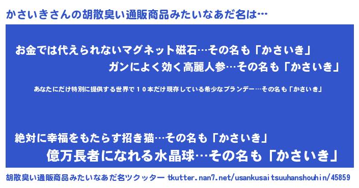 | 意味不明あだ名 | 『住所不定無職かさいき(77歳)』 |