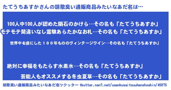 | ヘコむあだ名 | 『たてふぇ~』『たてうちあすか(震え声)』 |