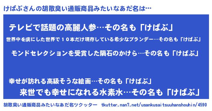 | 男性向けラノベタイトル風あだ名 | 『けばぶに滅ぼされるだけの簡単なお仕事です』 |